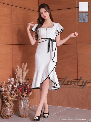 キャバドレス Andy ノースリーブ ジップデザイン ツイード チェーンベルト ウエストリボン フリル 膝丈ドレス