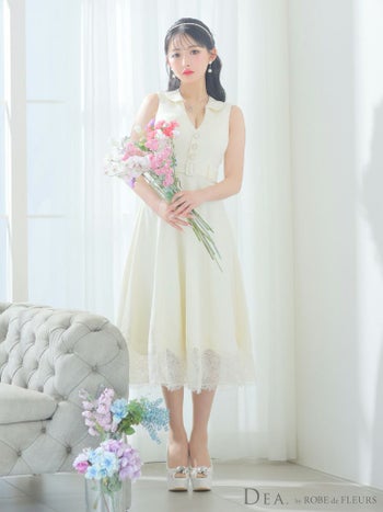 4. 【DEA.by ROBE de FLEURS/ディア】裾レース ノースリーブ 襟付き サマーツイード フレア ワンピース(DE3170)