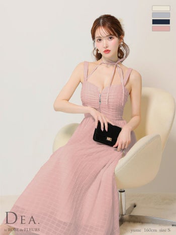 3. 【DEA.by ROBE de FLEURS/ディア】エレガント オープンバスト ジップデザイン ホルターネック リボン ノースリーブ 刺繍レース チェック柄 Aラインロングドレス (DE3283)
