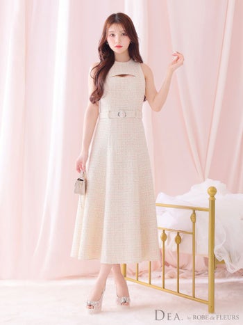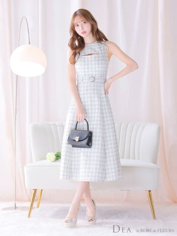 4. SALE【DEA.by ROBE de FLEURS/ディア】バストカット ベルトデザイン ノースリーブ チェック柄 ツイード ワンピース フレアロングドレス(DE3526)