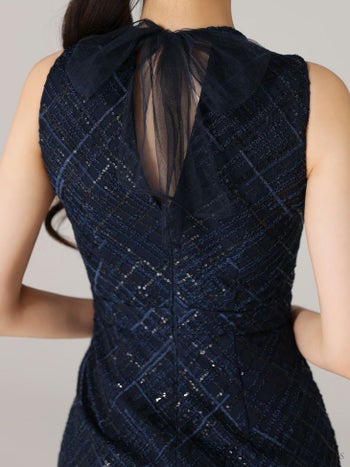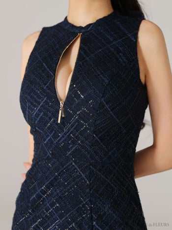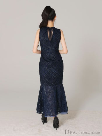 4. 【DEA.by ROBE de FLEURS/ディア】シンプル ワンピース ジップデザイン フリルマーメイド チェック柄 スパンコール付き刺繍レース ノースリーブ フレアロングドレス(DE3557)