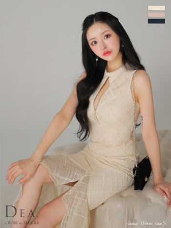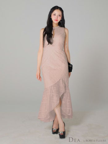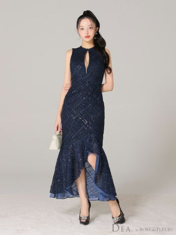 Lあり!目を引く上品な一枚♡ 【DEA.by ROBE de FLEURS/ディア】ジップデザイン スパンコール付き刺繍レース ノースリーブ フリルマーメイド チェック柄 シンプル ワンピース フレアロングドレス(DE3557)