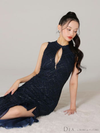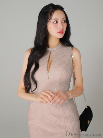 4. 【DEA.by ROBE de FLEURS/ディア】ジップデザイン スパンコール付き刺繍レース ノースリーブ フリルマーメイド チェック柄 シンプル ワンピース フレアロングドレス(DE3557)