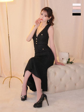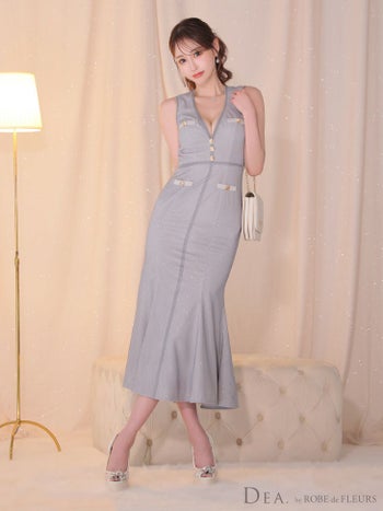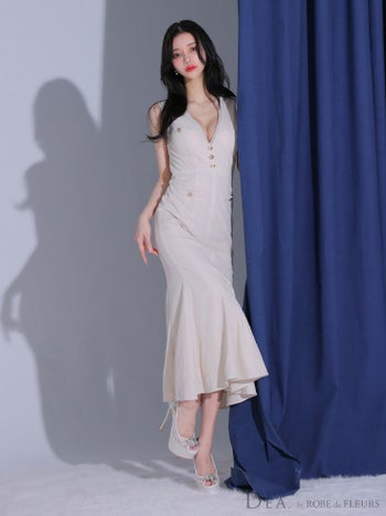 4. SALE【DEA.by ROBE de FLEURS/ディア】オープンバスト ノースリーブ シンプル ゴールドボタン ラメ マーメイドロングドレス(DE3720)