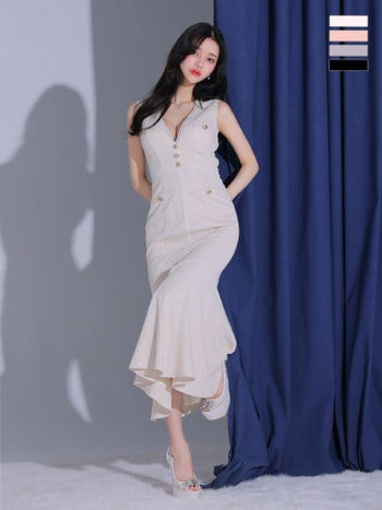 3. SALE【DEA.by ROBE de FLEURS/ディア】オープンバスト ノースリーブ シンプル ゴールドボタン ラメ マーメイドロングドレス(DE3720)