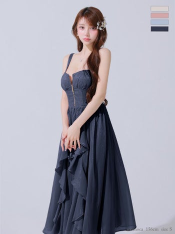 4. 【DEA.by ROBE de FLEURS/ディア】オープンバスト ジップデザイン サテン フリル エレガント ノースリーブ Aラインロングドレス (DE3927)
