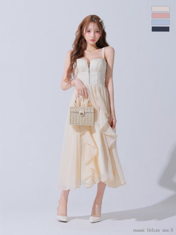 Lあり!スカートのボリューム感がポイント★ 【DEA.by ROBE de FLEURS/ディア】ジップデザイン サテン フリル エレガント ノースリーブ オープンバスト Aラインロングドレス (DE3927)