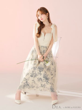 キャバドレス DEA. ROBE de FLEURS ディア ローブドフルール 花柄 チュール 肩リボン ジップデザイン ノースリーブ Aラインロングドレス