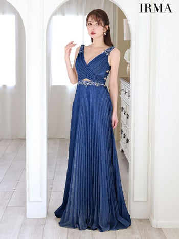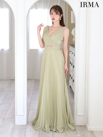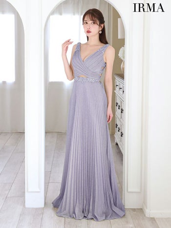 Lあり!エレガントなデザイン♪ 【IRMA/イルマ】エレガント オープンバスト ノースリーブ ウエストカット ビジュー プリーツ ラメニット Aラインロングドレス (41743)