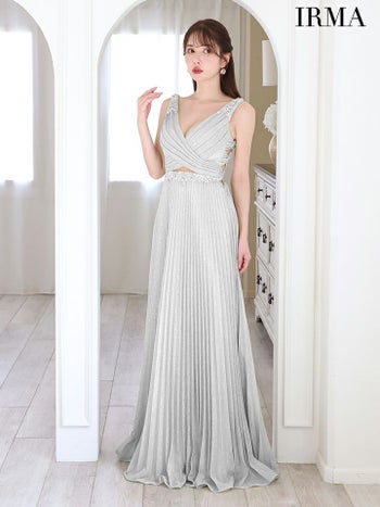 4. 【IRMA/イルマ】エレガント オープンバスト ノースリーブ ウエストカット ビジュー プリーツ ラメニット Aラインロングドレス (41743)