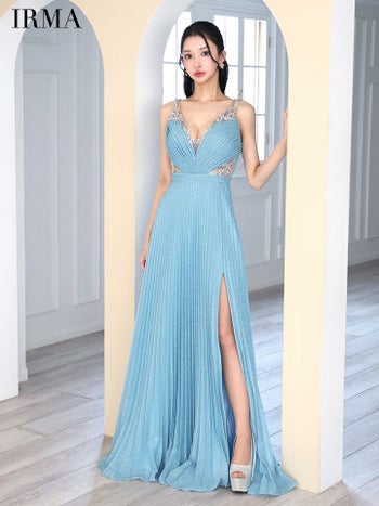 キャバドレス IRMA イルマ ノースリーブ スリット ラメニット セクシー プリーツ Aラインロングドレス