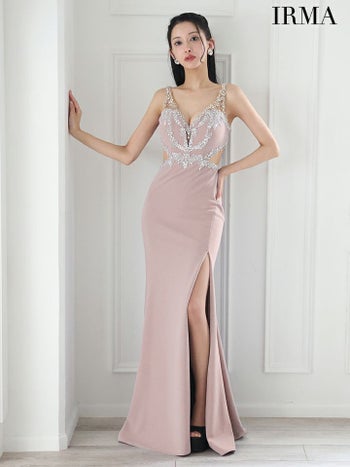 キャバドレス IRMA イルマ バックリボン ビジュー スリット くびれ透け ノースリーブ タイトロングドレス