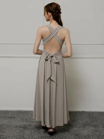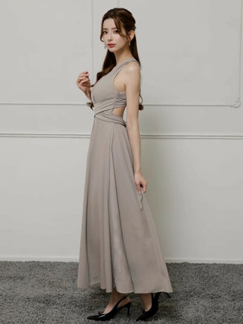 4. 【Veautt/ヴュート】ウエストクロス ノースリーブ ワンカラー Vカット バックオープン リボン Aラインロングドレス(VT022525)