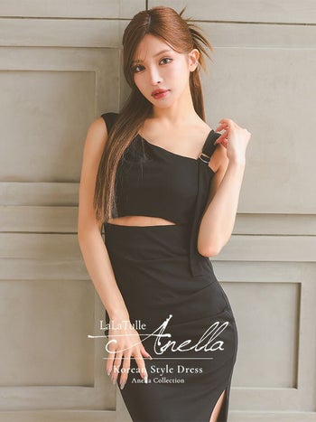 キャバドレス Anella アネラ ウエストカット セクシー ワンカラー ワンショル風 アシンメトリー ノースリーブ スリット タイト 膝丈ドレス