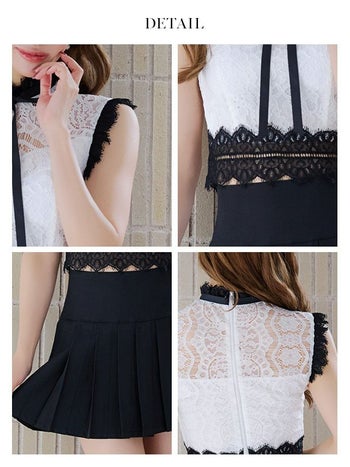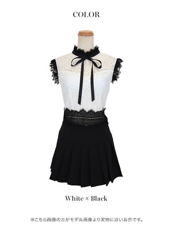 3. 【Anella/アネラ】ノースリーブ ネックリボン レーストップス プリーツスカート セットアップ フレアミニドレス
