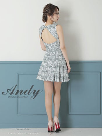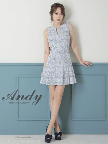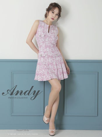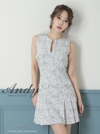 キャバドレス ミニドレス Andy アンディ プリーツ ツイード ストレッチ Aライン パールボタン ミックス柄 スリットネック ノースリーブ フレアミニドレス