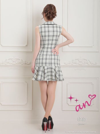 3. 【an/アン】ボタン フリル ノースリーブ チェック柄 襟付き タイトミニドレス(aoc3536)