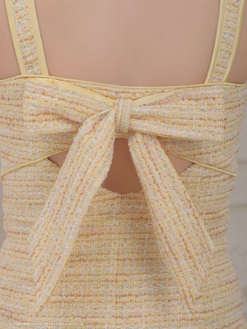 ジップデザイン  ツイード チェーン バックル リボン 飾りポケット ノースリーブ タイトミニドレスの全身バック画像2
