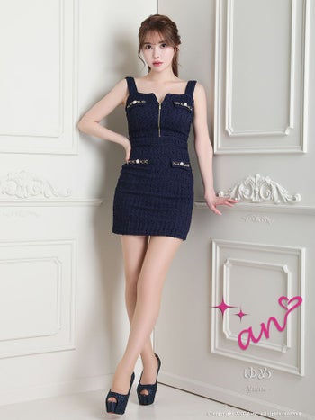 キャバドレス ミニドレス an アン ツイード ストレッチ ジップデザイン ノースリーブ チェーン ボタン タイトミニドレス