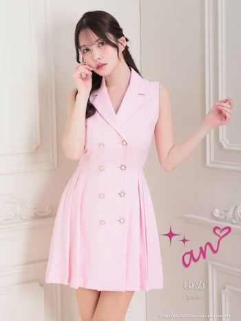 4. 【an/アン】ワンカラー ジャケット風 プリーツ Aライン パールボタン 襟付き ノースリーブ フレアミニドレス(aoc3737)