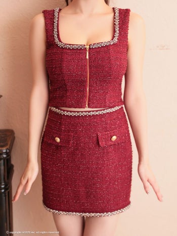XSあり!デコルテのビジューで顔周りを華やかに☆ 【an/アン】飾りポケット ジップデザイン ビジュー 金ボタン セットアップ ノースリーブ タイトミニドレス(aoc3786)