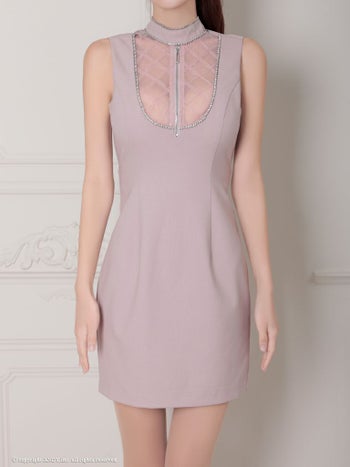 4. 【an/アン】ジップデザイン ビジュー レース ノースリーブ 背中開き タイトミニドレス(aoc3807)