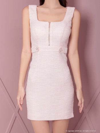 キャバドレス an ガーリー ジップデザイン ツイード ノースリーブ スクエアネック ウエストマーク パールボタン タイトミニドレス