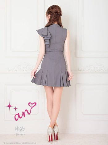 キャバドレス an ガーリー ジップデザイン ノースリーブ ポケット ショルダー フリル プリーツ フレアミニドレス