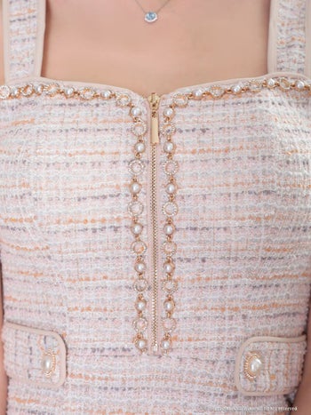 パールボタン ノースリーブ ツイード ジップデザイン ビジューライン タイトミニドレスのメイン画像1