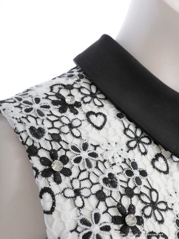 4. 【an/アン】ジップデザイン ノースリーブ フラワー レース モノトーン 襟付き ウエストマーク フレアミニドレス(aoc3889)
