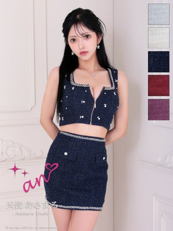 キャバドレス an アン チェック柄 ツイード ジップデザイン セットアップ ノースリーブ スクエアネック ビジュー 飾りポケット タイトミニドレス