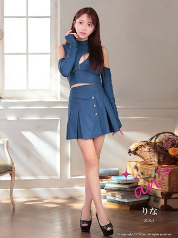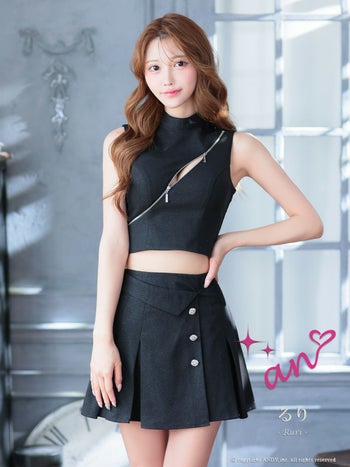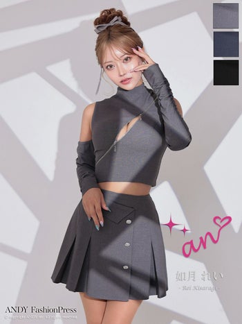 キャバドレス an アン 長袖 ジップデザイン ノースリーブ セットアップ ハイネック ワンカラー ビジューボタン プリーツ フレアミニドレス