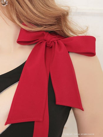 ノースリーブ バイカラー ジップデザイン アシンメトリー リボン ワンショルダー タイトミニドレスのメイン画像3