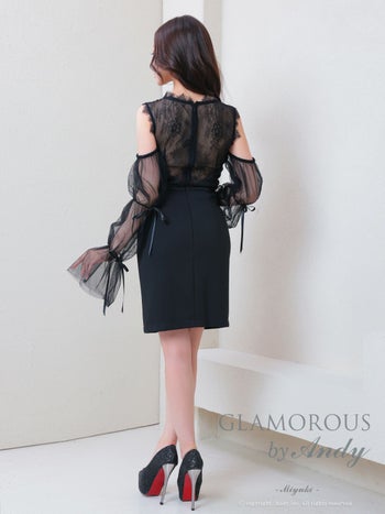 キャバドレス GLAMOROUS 2way ノースリーブ 長袖 リボン シアースリーブ ウエストカット バストカット ビジュー レース スリット タイトミニドレス