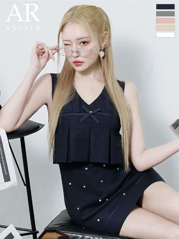 XSあり!上品なガーリードレス♡ 【Angel R/エンジェルアール】プリーツ パール ノースリーブ リボン ビジュー フレアミニドレス (AR25223)