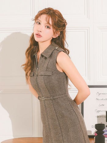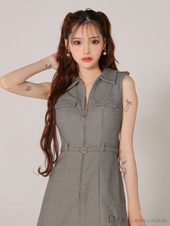 4. 【DEA.by ROBE de FLEURS/ディア】シンプル 襟付き ジップデザインウエストベルト ノースリーブ フレアミニドレス(DE3259)