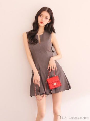 4. 【DEA.by ROBE de FLEURS/ディア】プリーツ シンプル ノースリーブ サイドベルトモチーフ オープンバスト ワンカラー フレアミニドレス (DE3362)