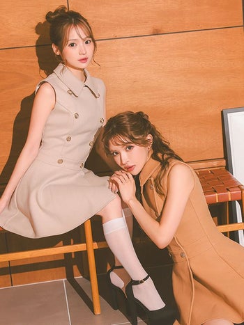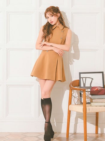 キャバドレス DEA. ROBE de FLEURS ディア ローブドフルール 襟付き プリーツ ダブルボタン シンプル ノースリーブ メルトン フレアミニドレス