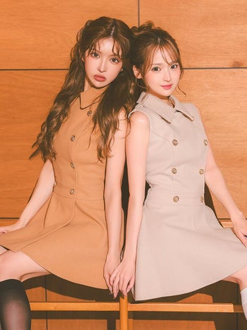 4. 【DEA.by ROBE de FLEURS/ディア】ダブルボタン ノースリーブ メルトン クラシカル 襟付き プリーツ フレアミニドレス (DE3365)