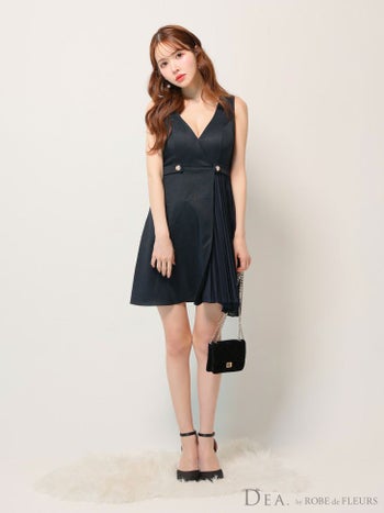 キャバドレス ブランド プリーツ ノースリーブ サマーツイード ウエストボタン シフォン フレアミニドレス