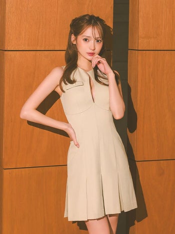4. 【DEA.by ROBE de FLEURS/ディア】ゴールドボタン バストカット ノースリーブ プリーツ シンプル フレアミニドレス (DE3744)