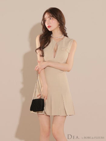 3. 【DEA.by ROBE de FLEURS/ディア】ゴールドボタン バストカット ノースリーブ プリーツ シンプル フレアミニドレス (DE3744)