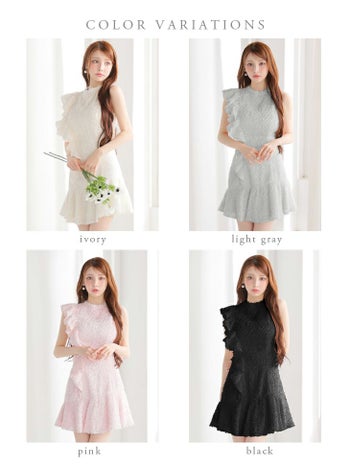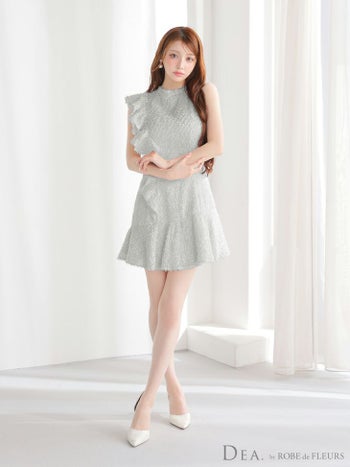 キャバドレス DEA. ROBE de FLEURS ディア ローブドフルール フリンジジャガード アシメ ノースリーブ フリル ハイネック フレアミニドレス