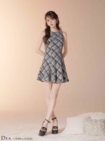 4. 【DEA.by ROBE de FLEURS/ディア】ハイネック ノースリーブ ツイード チェック柄 フレアミニドレス (DE4620)