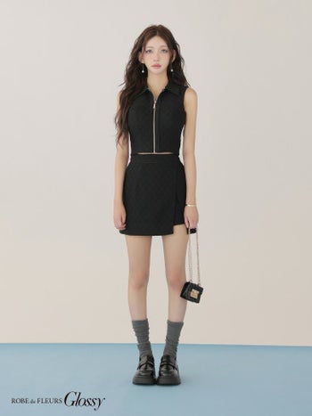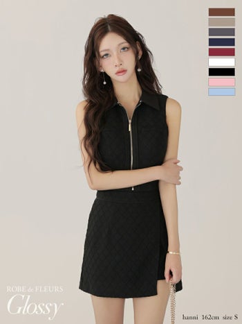 4. 【Glossy by ROBE de FLEURS/グロッシー】セットアップ ワンカラー ジャガードニット ノースリーブ 襟付き ジップデザイン ラップスカート タイトミニドレス(GL3261)