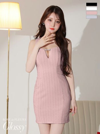 3. SALE【Glossy by ROBE de FLEURS/グロッシー】バストカット ビジュー ストレッチ ノースリーブ ラインストーン付きリブ タイトミニドレス(GL3537)