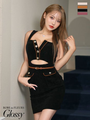 4. SALE【Glossy by ROBE de FLEURS/グロッシー】セクシー オープンバスト レザーパイピング ウエストカット ベルト ポケット ノースリーブ タイトミニドレス (GL3609)