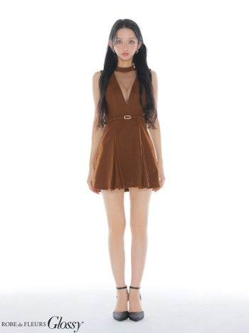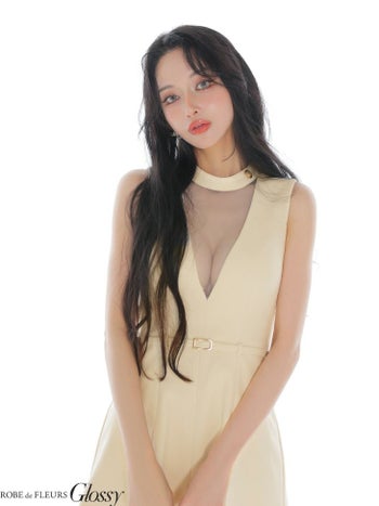 4. 【Glossy by ROBE de FLEURS/グロッシー】メルトン ウエストベルト ノースリーブ チュール Vネック フレアミニドレス(GL3957)
