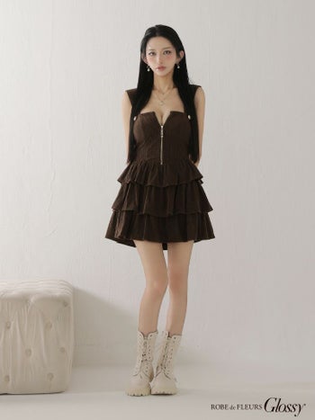 4. 【Glossy by ROBE de FLEURS/グロッシー】2way フーディー ティアード ジップデザイン チェック柄 ベアトップ ノースリーブ フレアミニドレス (GL4621)