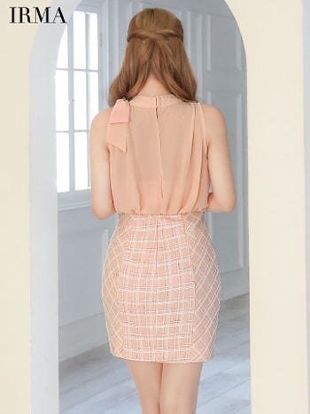 キャバドレス IRMA イルマ リボン シフォン バストカット パールボタン ノースリーブ チェック柄 サマーツイード タイトミニドレス